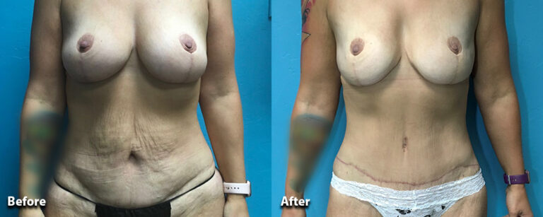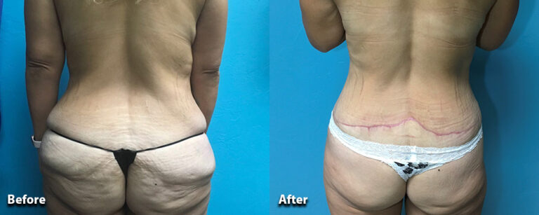 Our patient had lost over 100 pounds through diet and exercise. She had a circumferential body lift to improve the contour of her abdomen and buttocks.