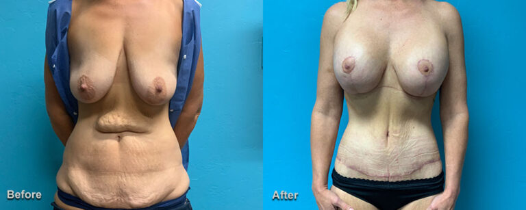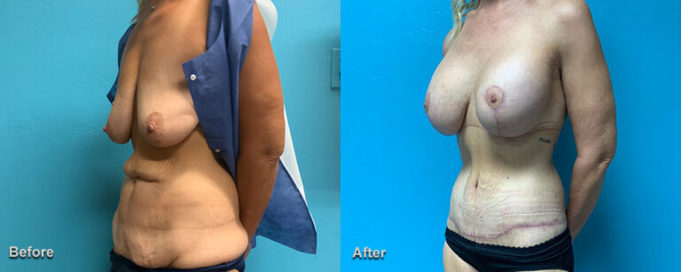 This woman had a gastric sleeve for weight loss. She lost 130 pounds. Following her weight loss, she had a circumferential body lift, a breast augmentation with 385cc silicone gel breast implants, and a bilateral mastopexy.