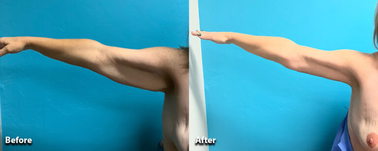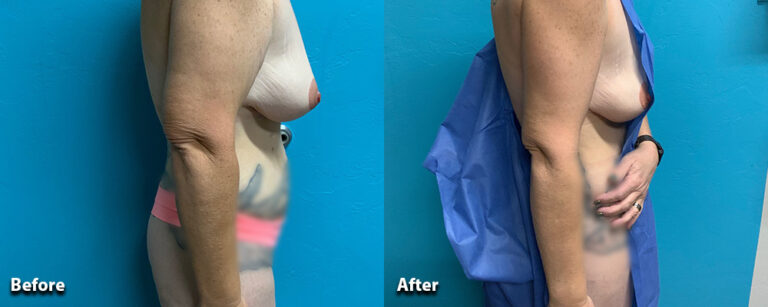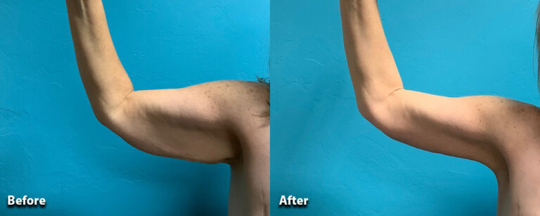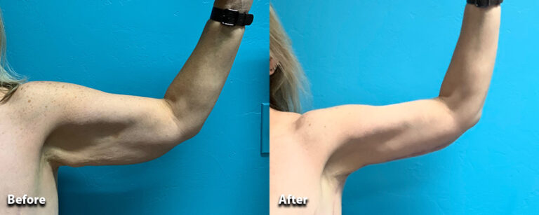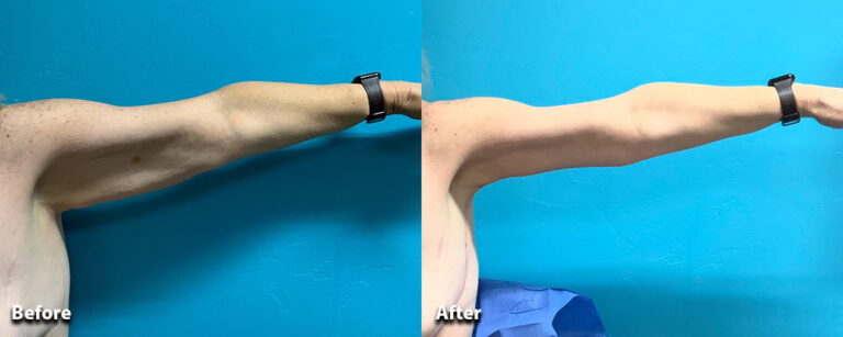 Our patient lost over 150 pounds following weight loss surgery. We performed an extended brachioplasty to remove the excess skin on her upper arms and sides.