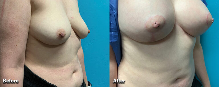 This woman had a bilateral mastopexy and breast augmentation with 455cc silicone implants. (She also had liposuction of her abdomen at the same time.)