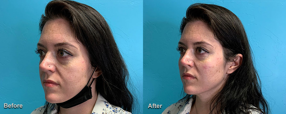 This young woman has lost 100 pounds through diet and exercise. As she lost weight, she noticed that she had lost fullness in her cheeks. She underwent an injection with 3cc of Radiesse in her cheeks to add fullness.